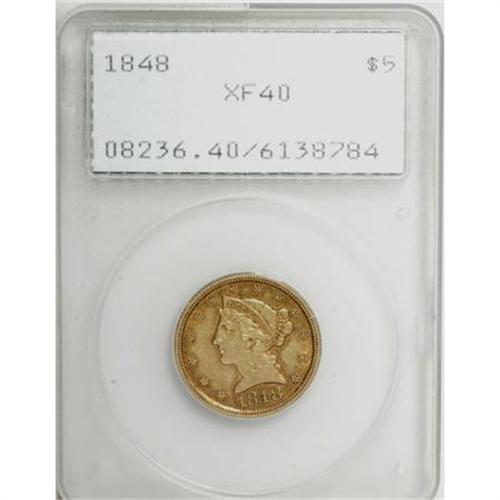 <B>1848 $5 XF40 PCGS.</B></I> PCGS Population (15/119). NGC Census: (7/272). Mintage: 260,775. Numismedia Wsl. Price for NGC/PCGS coin in XF40: $215. (#8236)<BR><BR><B>Coin Engraver:</B> Christian Gobrecht<BR><BR><b>Shipping:</b> Coins & Currency (<a target="_blank" href="http://www.heritageauctions.com/common/shipping.php">view shipping information</a>)