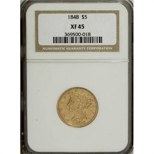 <B>1848 $5 XF45 NGC.</B></I> NGC Census: (43/222). PCGS Population (25/90). Mintage: 260,775. Numismedia Wsl. Price for NGC/PCGS coin in XF45: $250. (#8236)<BR><BR><b>Shipping:</b> Coins & Currency (<a target="_blank" href="http://www.heritageauctions.com/common/shipping.php">view shipping information</a>)
