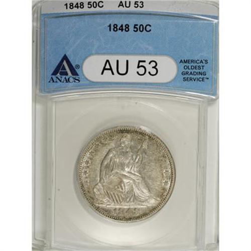 <B>1848 50C AU53 ANACS.</B></I> NGC Census: (2/44). PCGS Population (4/40). Mintage: 580,000. Numismedia Wsl. Price for NGC/PCGS coin in AU53: $425. (#6260)<BR><BR><B>Coin Engraver:</B> Christian Gobrecht<BR><BR><b>Shipping:</b> Coins & Currency (<a target="_blank" href="http://www.heritageauctions.com/common/shipping.php">view shipping information</a>)