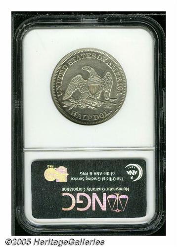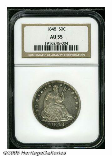 <B>1848<50C> AU55 NGC.</B></I> WB-101. Well struck with lovely purple-russet and sea-green color near selected peripheral regions. Lightly worn with a few minor surface blemishes and some apparent hairlines in the fields. An attractive AU coin. Population: 1 in 55, 39 finer (5/05).