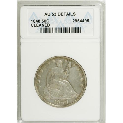 <B>1848 50C --Cleaned--ANACS. AU53 Details.</B></I> NGC Census: (2/43). PCGS Population (3/40). Mintage: 580,000. (#6260)<BR><BR><b>Shipping:</b> Coins & Currency (<a target="_blank" href="http://www.heritageauctions.com/common/shipping.php">view shipping information</a>)