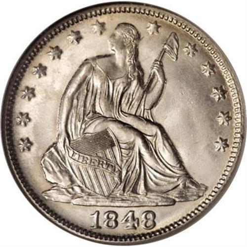 <B>1848 50C MS65 NGC.</B></I> Ex: Sweet Collection. Bright white, with heavy visible luster, this is one of only five of this date to merit a Gem grade from a major grading service (12/07), with none graded finer, and only the third such Gem we have had the pleasure to handle. A little bit of strike weakness is noted on some of the upper stars and the F in Half; however, the overall eye appeal is tremendous. A few inconsequential marks can be seen in the fields, presumably the grade-limiting factors.<BR><I>Ex: Bowers and Merena, lot 1483 (3/04).</B></I><BR><BR><B>Coin Engraver:</B> Christian Gobrecht<BR><BR><b>Shipping:</b> Coins & Currency (<a target="_blank" href="http://www.heritageauctions.com/common/shipping.php">view shipping information</a>)