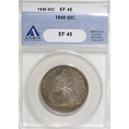 <B>1848 50C XF45 ANACS.</B></I> NGC Census: (2/46). PCGS Population (0/53). Mintage: 580,000. Numismedia Wsl. Price for NGC/PCGS coin in XF45: $294. (#6260)<BR><BR><B>Coin Engraver:</B> Christian Gobrecht<BR><BR><b>Shipping:</b> Coins & Currency (<a target="_blank" href="http://www.heritageauctions.com/common/shipping.php">view shipping information</a>)