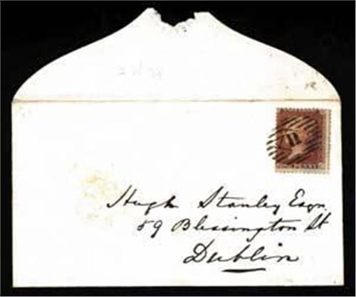 1855 July 12 envelope to Dublin franked with 1854-57 1d red brown pl.5 (SG 24) tied by a London '11' numeral, addressed to Dublin and backstamped accordingly for JY.12.1855 and JY.13.1855, envelope also bears on inside of backflap a fine printed advert fo