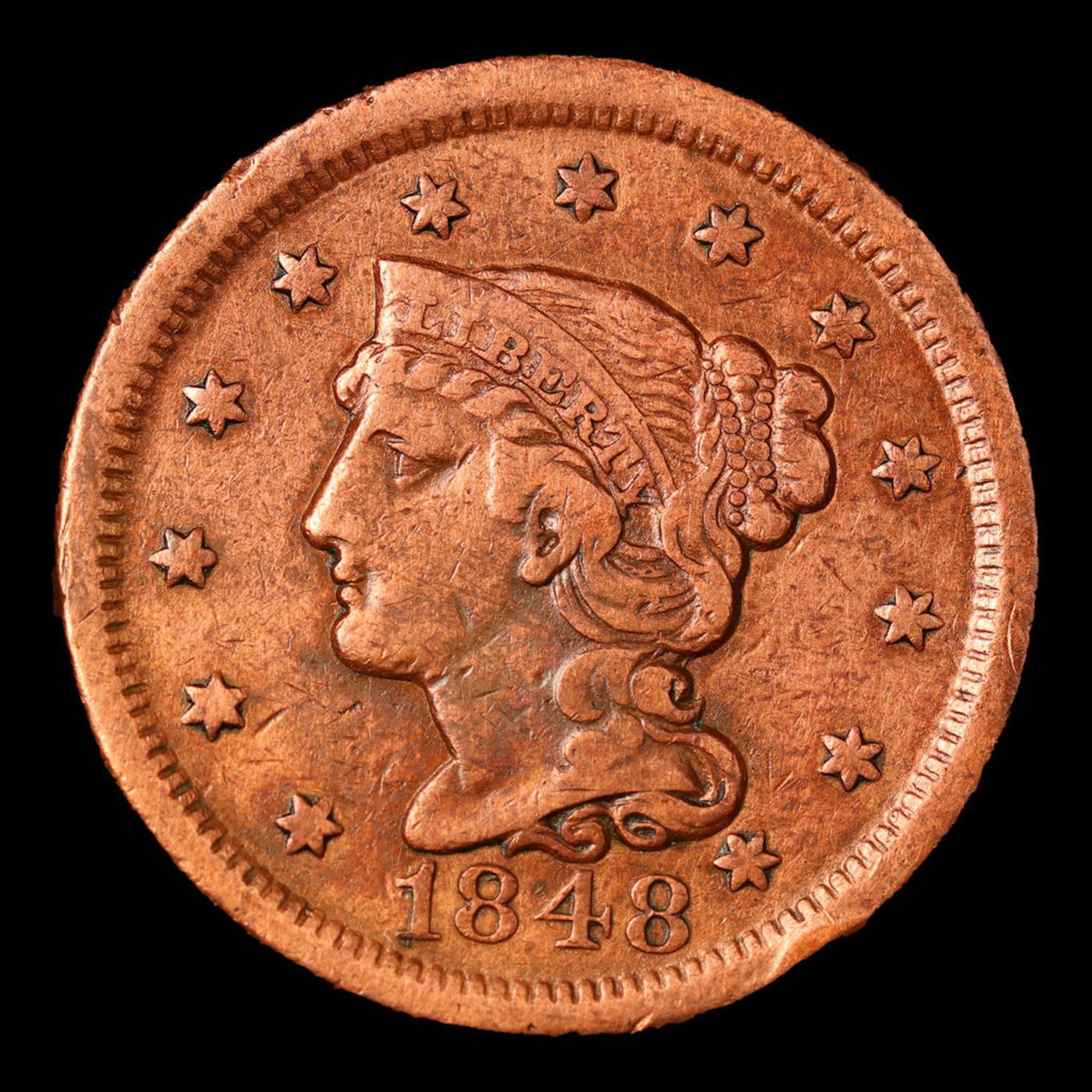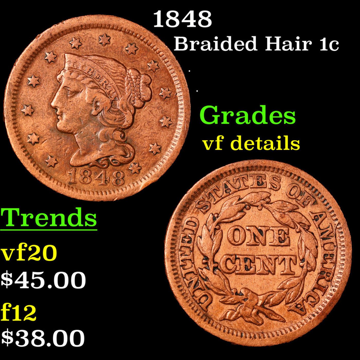 1848 Braided Hair Large Cent 1c Grades vf details.