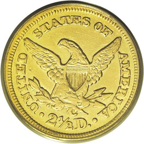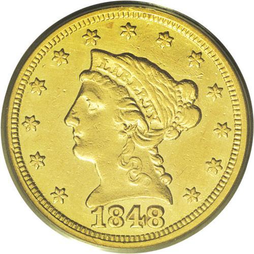 <B>1848-C<$2 1/2> AU53 PCGS.</B></I> Variety 9-F. Glimmers of bright luster outline the legends and devices. The strike is above average for a Charlotte product, although the lower portion of the eagle and Liberty's forehead curls are soft. Careful inspection fails to locate any mentionable contact. A scant 16,788 pieces were struck. Population: 7 in 53, 13 finer (7/06).