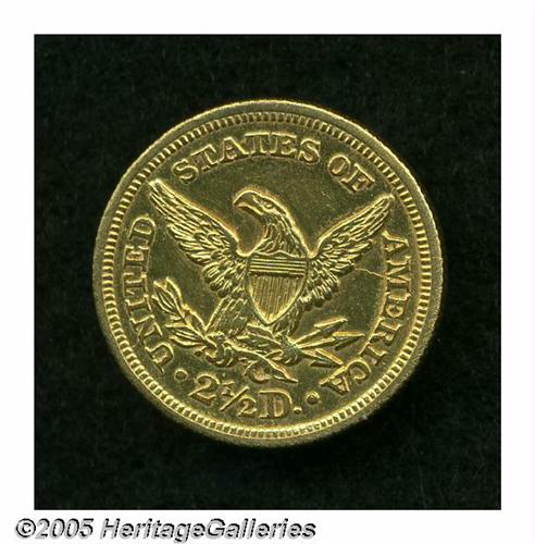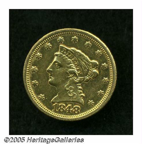 <B>1848-C<$2 1/2> AU55 Cleaned, Uncertified.</B></I> Noticeable prooflike luster outlines protected areas, but a few light hairlines are seen in the fields on each side. This is probably an early strike as no planchet buckling is noted on the obverse. A very scarce and low mintage issue from the Charlotte Mint.