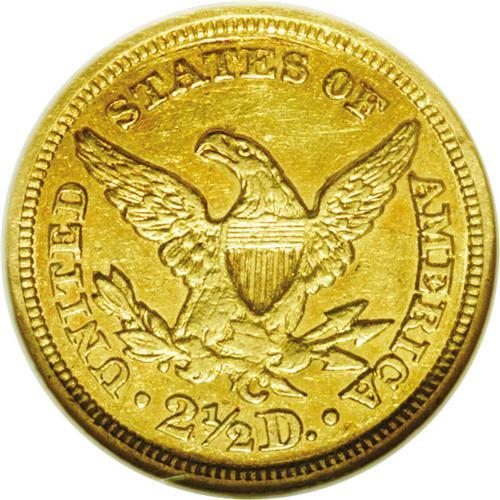 <B>1848-C<$2 1/2> AU55 NGC.</B></I> Variety 9-F. Suitably struck despite its Charlotte Mint origin, with softer definition mostly relegated to the lower half of the eagle. This light golden-brown representative has a few faint hairlines on the upper left obverse field, and thin marks are noted near the cheekbone, the U in UNITED, and above STATES. Only 16,788 pieces were struck.