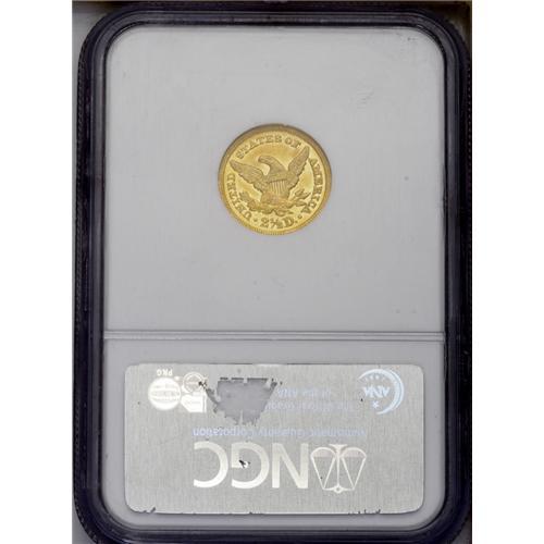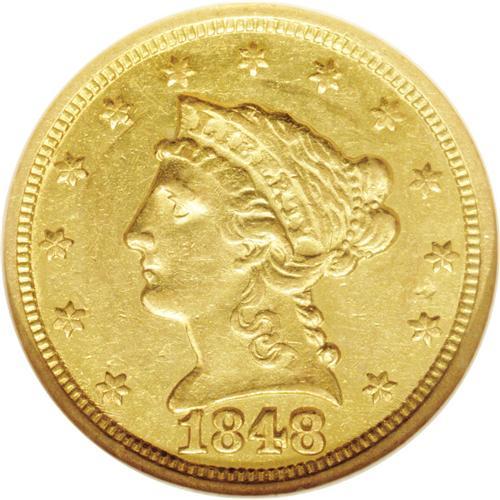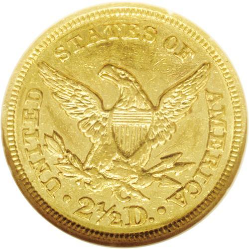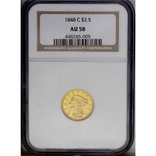 <B>1848-C<$2 1/2> AU58 NGC.</B></I> Variety-9-F. This variety pairs this new obverse with the thick digits in the date to the reverse used in prior years, always with a die crack from the M to the left wing. Two minor die cracks connect each wing tip to the rim nearby, and another is found from the base of the U to the leaf. Sharp on all the obverse stars and Liberty's curls, although there is some minor weakness found on the lower portions of the eagle. Coppery-gold splashes mix with the dominate orange-gold to produce the desirable antique appearance. Scattered handling abrasions, including a couple of minor scratches above the arrows, which will serve to hallmark the present coin. Scarce this nice and rare finer.