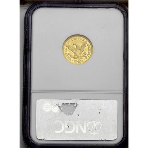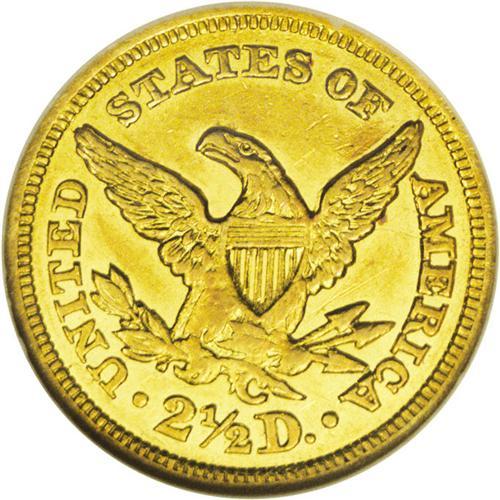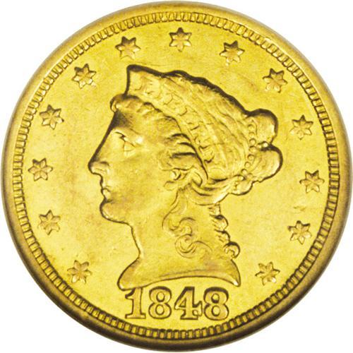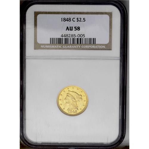 <B>1848-C<$2 1/2> AU58 NGC.</B></I> Variety 9-F. This variety pairs this new obverse with the thick digits in the date to the reverse used in prior years, always with a die crack from the M to the left wing. Two minor die cracks connect each wing tip to the rim nearby, and another is found from the base of the U to the leaf. Sharp on all the obverse stars and Liberty's curls, although there is some minor weakness found on the lower portions of the eagle. Coppery-gold splashes mix with the dominant orange-gold to produce the desirable antique appearance. Scattered handling abrasions, including a couple of minor scratches above the arrows, which will serve to hallmark the present coin. Scarce this nice and rare finer.