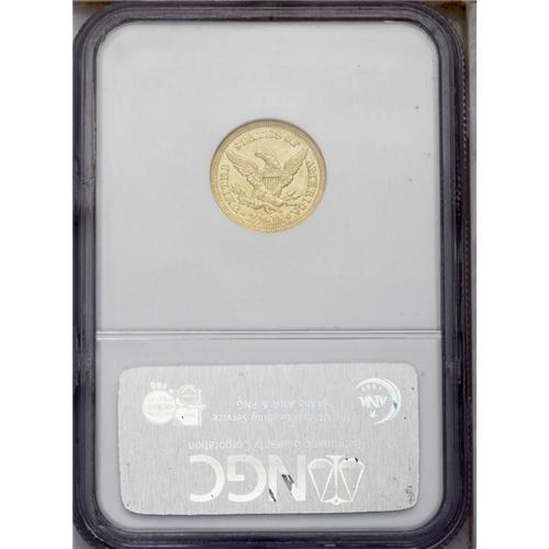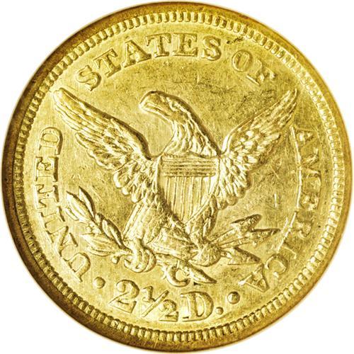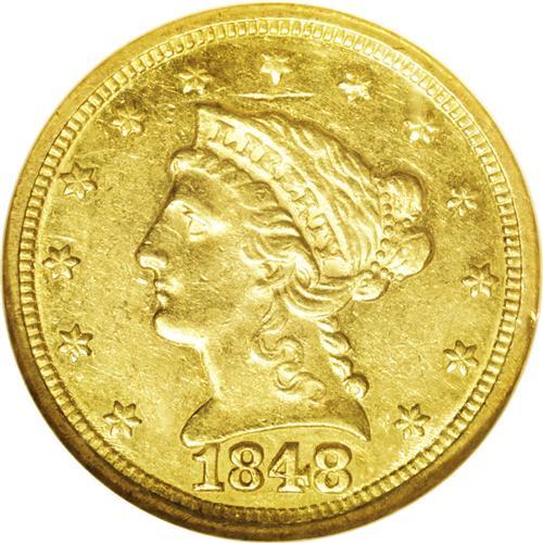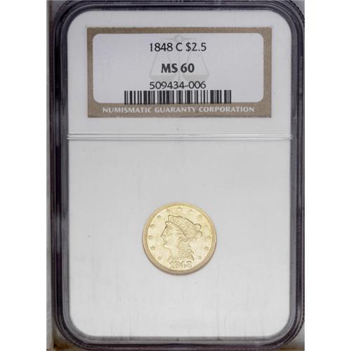 <B>1848-C<$2 1/2> MS60 NGC.</B></I> Variety 9-F. While no Charlotte Mint quarter eagle can be called common, the 1848-C is one of the more frequently encountered C-mint issues, with a respectable mintage of 16,788 pieces. Nonetheless, it is a condition rarity of the first order, being scarce in XF or higher condition and nearly unobtainable in Uncirculated grade. Collecting of coins with mintmarks was a virtually unknown practice when this coin was minted. Contemporary numismatists collected one example from each year, without regard for the issuing mint. Augustus Heaton's 1893 <I>A Treatise on Mint Marks</B></I> helped the cause, but the practice became common only in the 1930s. By that time, most Charlotte and Dahlonega coins were well worn, with the average grade being VF. This is a bright example with a slight accent of reddish patina present. The striking details are above average for a C-mint, and the most obvious pedigree identifiers are a pair of field marks on the obverse, one is located between stars 4 and 5, the other above the head of Liberty.