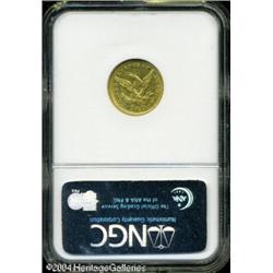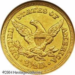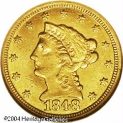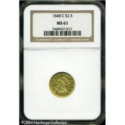 1848-C $2 1/2 MS61 NGC. While a fairly common coin <B>1848-C $2 1/2 MS61 NGC.</B></I> While a fairly common coin in lower grades, the '48-C is difficult to locate above the XF level. Even if one were to encounter a Mint State representative, the eye appeal would most likely be limited due to typical poor striking characteristics. In stark contrast, this is an appealing coin despite the assigned MS61 grade. The strike is even and average for the issue. The number of abrasions are typical for the grade, but the green-gold surfaces are exceptionally bright, lustrous, and confirm this coin's originality. Three noticeable marks are seen on the obverse and can confirm the identity of this coin for future collectors. One is in the obverse field, curving above stars 1 and 2, another smaller one is between star 3 and Liberty's nose. A contact mark is prominent on Liberty's lower jaw. To date (11/04), NGC and PCGS combined report three coins in MS60, six pieces in MS61, and six specimens in MS62, with none finer. Several of these coins may represent resubmissions. <BR><BR><B>Important notice:</B> Heritage usually auctions material at the rate of 200-250 lots per hour. On some occasions eBay Live bid software or the Internet may not be able to keep up with the pace of the auction. We recommend placing a realistic absentee bid now as insurance to avoid disappointment. Occasionally the auctioneer may eliminate or reject an eBay Live bid, and the auctioneer may also reopen a lot after the close of the eBay live bidding (usually because we missed an audience bid), and may reject your bid even if it shows you as the winning bidder. By bidding via eBay Live, you agree that Heritage may award the lot to another bidder at its sole discretion under the circumstances described above or any other reasonable circumstances. Since eBay bids are not shown to us until we open the lot on the floor, we treat those bids just like floor bids. In most cases the floor responds before the eBay bid is presented to us, due to Internet lag time, so for consistency we have made it a policy that floor bids are always considered first over tie eBay live bids. Also please note that all Heritage lots purchased through eBay Live carry a 20% Buyer's Premium. Please make sure you read the Terms and Conditions before you bid. This lot is being auctioned in conjunction with a live floor auction by Heritage Galleries & Auctioneers. All final auction and invoice information will be supplied by Heritage Galleries & Auctioneers, and all other information should be considered preliminary. Lot:6495