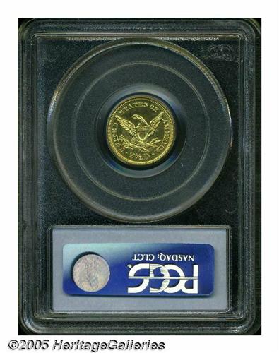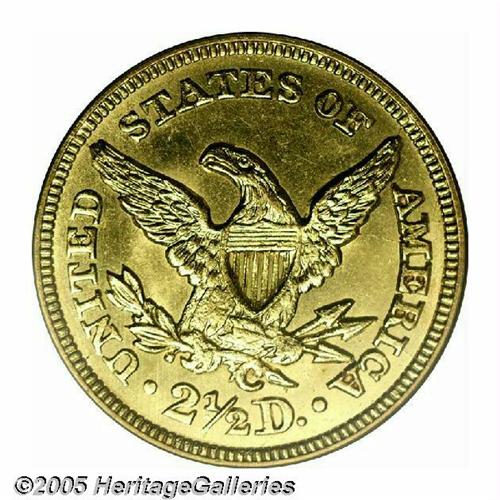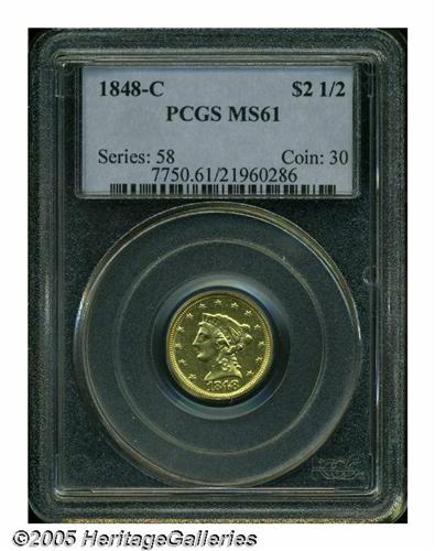 <B>1848-C<$2 1/2> MS61 PCGS.</B></I> Variety 10-F. Doug Winter recorded two different varieties of the 1848-C Quarter Eagle, labeled 9-F and 10-F. The reverse, therefore, is the same on both. His descriptions of the two different obverse dies are similar, and we believe this matches obverse 10. This example has extremely weak obverse details with much stronger reverse details. The hair details are only partially visible, and most of the stars are flat. On the reverse, only the claws and the leg left of the shield show signs of weakness. This is unquestionably a Mint State coin with full and complete luster. There is no evidence of wear on either side. The fields have satiny, slightly reflective surfaces with considerable greenish-gold color. Given the appearance of this example, it would be easy to see how just the slightest wear on a similarly struck coin would simulate a much lower grade. Grading of these coins in general terms is as much an assessment of remaining luster and surface quality as it is existing design details. This is a splendid example and among the finer pieces known. Population: 2 in 61, 1 finer (5/05).