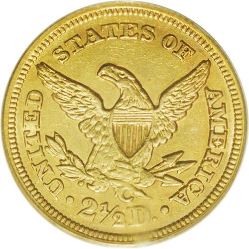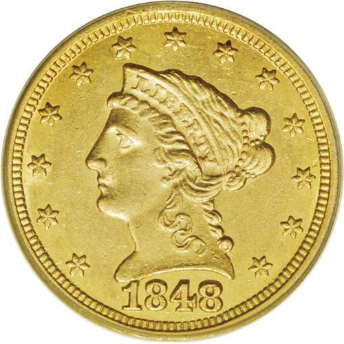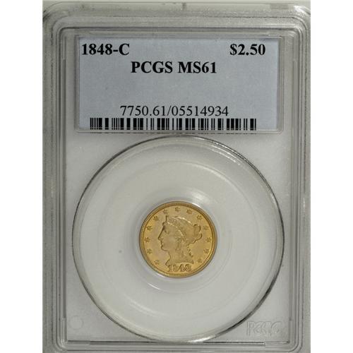 <B>1848-C $2 1/2 MS61 PCGS.</B></I> Variety 9-F. The second 8 in the date is closer to the rim than the bust. One of the finest certified examples of this scarce Charlotte issue. Only 16,788 pieces were struck, and only a handful of Mint State survivors are known. The strike is surprisingly sharp, with softness limited to the E in LIBERTY and a few feathers on the left (facing) leg. The orange-yellow and olive-green surfaces lack identifying marks, and the eye appeal is excellent given the mint of origin. Population: 2 in 61, 1 finer (11/06).<BR><BR><b>Shipping:</b> Coin/Currency (<a target="_blank" href="http://www.heritageauctions.com/common/shipping.php">view shipping information</a>)