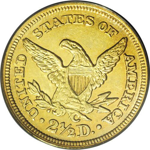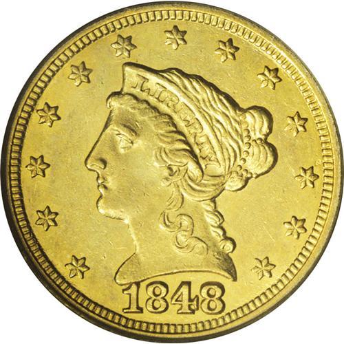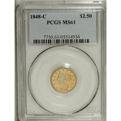 <B>1848-C<$2 1/2> MS61 PCGS.</B></I> Variety 9-F. While a collectible coin in lower grades, the '48-C is difficult to locate above the XF level. Even if one were to encounter a Mint State representative, the eye appeal would most likely be limited due to poor striking characteristics. In stark contrast, this is an appealing coin for the MS61 grade. The strike is even, and exceptionally bold for the issue. Unlike the present piece, other Mint State examples seen show little detail on Liberty's hair or the eagle's head. The number of abrasions are anything but excessive for the grade, but the green-gold surfaces are somewhat subdued. Population: 2 in 61, 1 finer (8/06).<BR><I>Ex: Fort Lauderdale Bullet, (Heritage, 3/00), lot 463; Ashland City Collection (Heritage, 1/03), lot 4683.</B></I><BR><I>From The Della Collection.</B></I>