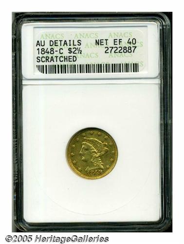 <B>1848-C<$2 1/2>--Scratched--ANACS. AU Details, Net XF40.</B></I> Bright honey-gold surfaces display traces of luster in the protected areas. The design elements are adequately defined though the centers are weakly struck (which is typical of the issue), especially in portions of Liberty's hair and on the eagle's legs. Minute contact marks are noted on Liberty's cheek and a few wispy hairlines are scattered about. A few small pinscratch-like marks are visible in the upper reverse field.