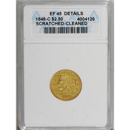 <B>1848-C $2 1/2 --Scratched, Cleaned--ANACS. XF45 Details.</B></I> Variety 9-F. This mid-date Charlotte issue had a low mintage of just 16,788 pieces, and the issue is challenging in AU and better grades. This briefly circulated mustard-gold example displays suspicious luminosity and shows a scratch from Liberty's lips to 9 o'clock on the obverse rim.<BR><BR><B>Coin Engraver:</B> Christian Gobrecht<BR><BR><b>Shipping:</b> Coins & Currency (<a target="_blank" href="http://www.heritageauctions.com/common/shipping.php">view shipping information</a>)