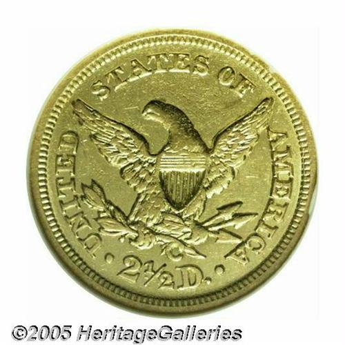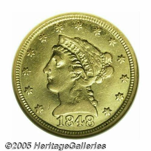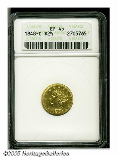<B>1848-C<$2 1/2> XF45 ANACS.</B></I> Variety 9-F. An elusive Charlotte Quarter Eagle that is not only rare in the absolute sense, but is a condition rarity as well with pieces in XF and higher infrequently encountered. The fields of this piece have a semi-reflective quality and are minimally abraded. The striking details are well defined on the hair curls and stars, but show the usual softness on the eagle's neck and leg. Typical planchet buckling is seen over the obverse.