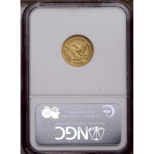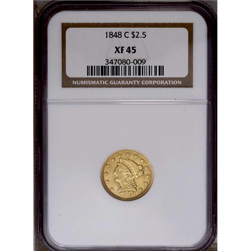 <B>1848-C<$2 1/2> XF45 NGC.</B></I> Variety 10-F. The buckled lower obverse field (as made) identifies the variety. A lightly abraded and typically struck green-gold example. An unimportant reverse rim ding is noted at 1:30. A scant 16,788 pieces were struck.