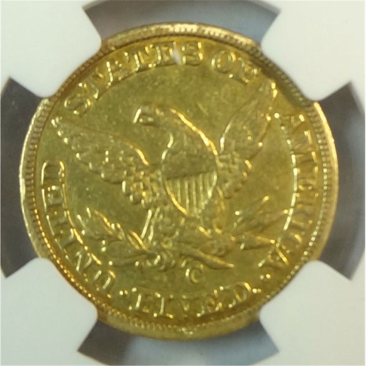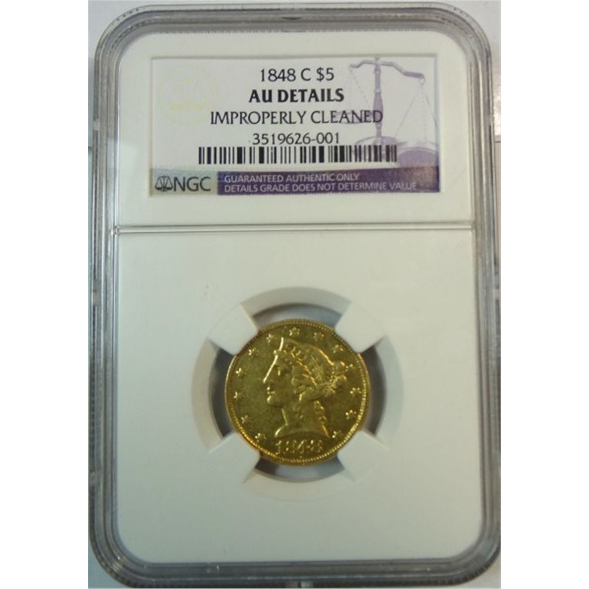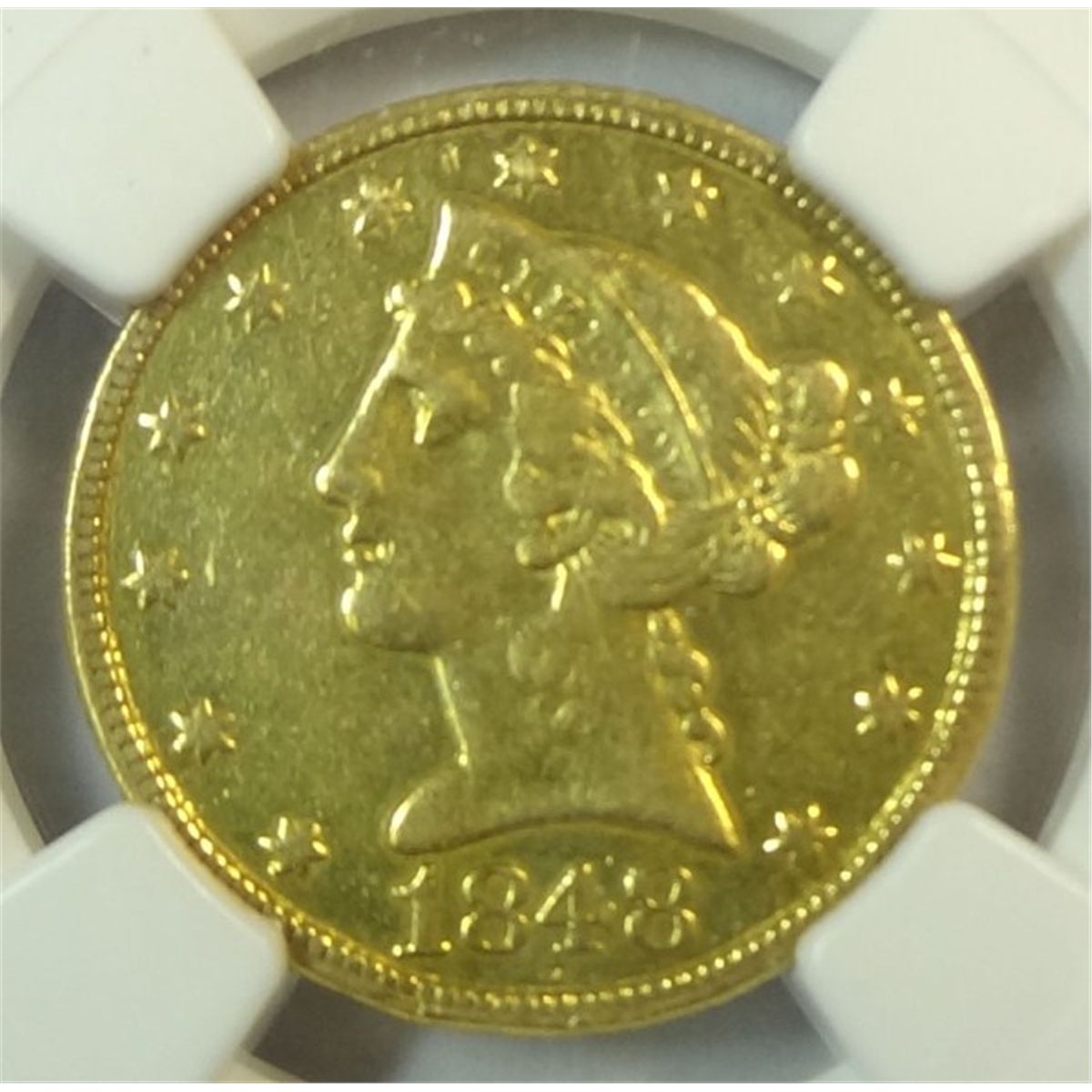 1848-C $5.00 GOLD LIBERTY, NGC AU, LIGHTLY CLEANED AT ONE TIME. BARGAIN