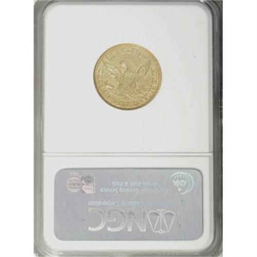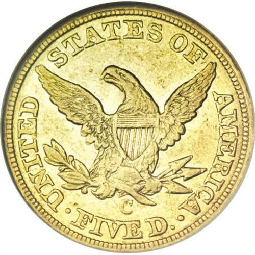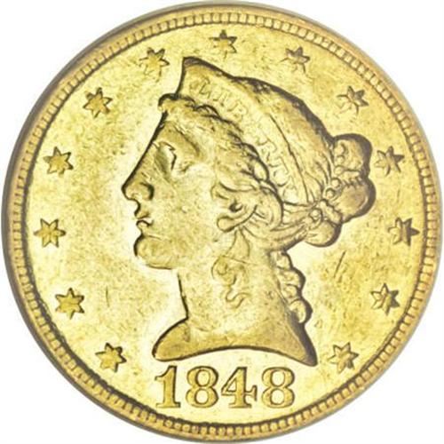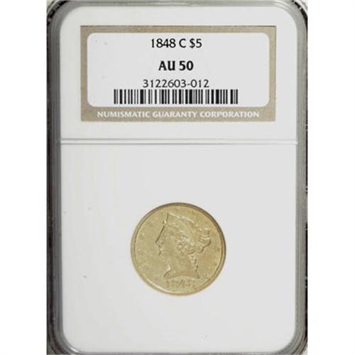 <B>1848-C $5 AU50 NGC.</B></I> Variety 11-E. The wingtips, hair bun, and eyebrow show slight wear, but luster illuminates protected areas. The obverse and the reverse field are typically abraded. A problem-free canary-gold example of this elusive Charlotte issue.<BR><I>Ex: Dartmouth Sale (Kingswood Galleries, 2/91), lot 7006.</B></I><BR><I>From The John Stimson, Sr. Collection, Part Two.</B></I><BR><BR><B>Coin Engraver:</B> Christian Gobrecht<BR><BR><b>Shipping:</b> Coins & Currency (<a target="_blank" href="http://www.heritageauctions.com/common/shipping.php">view shipping information</a>)
