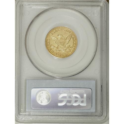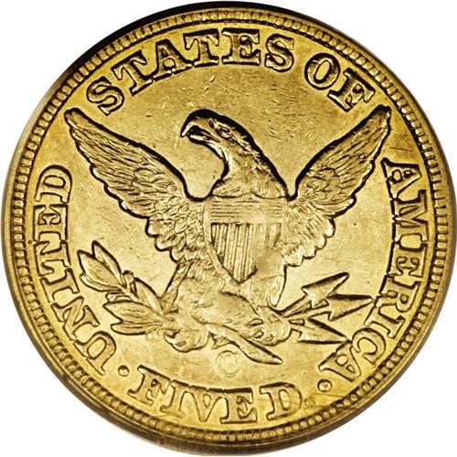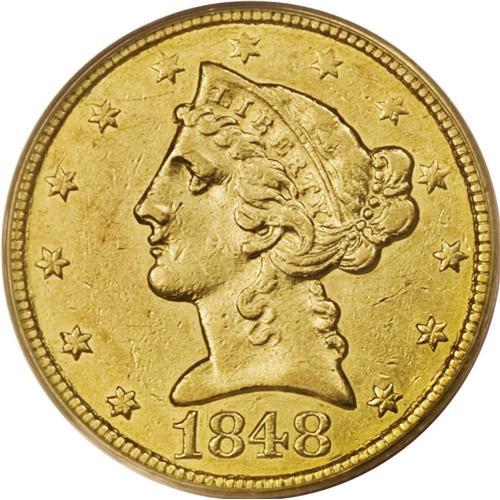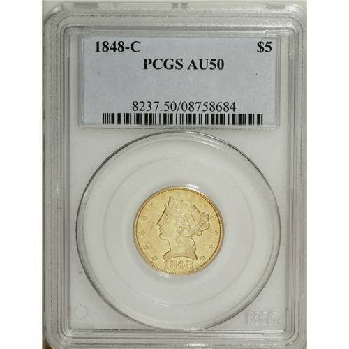 <B>1848-C $5 AU50 PCGS.</B></I> Variety 11-E. Although a comparatively high mintage Charlotte issue, the 1848-C half eagle saw widespread circulation and survivors are far more challenging in AU or higher grades. The present example offers moderately abraded surfaces and a typical strike, but those distractions are accompanied by ample prooflike luster in the fields. Census: 15 in 50, 58 finer (12/06).<BR><BR><b>Shipping:</b> Coin/Currency (<a target="_blank" href="http://www.heritageauctions.com/common/shipping.php">view shipping information</a>)