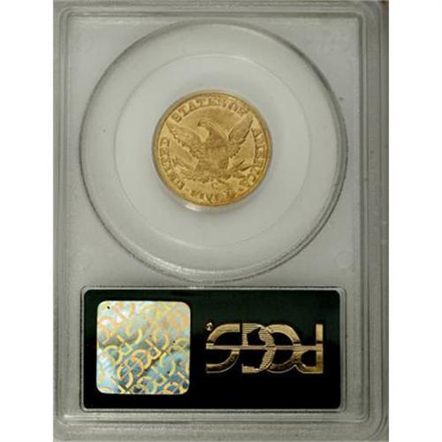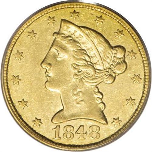 <B>1848-C $5 AU50 PCGS.</B></I> This sharply struck example has nearly complete detail except for some minor weakness in the center of the reverse. The surfaces are clean with no deep marks noted; a couple of small ticks are visible in the obverse fields. The reverse is very choice. The luster on the obverse is slightly dull while it is richer in appearance on the reverse. However, this coin does not appear to have been cleaned or dipped and the overall appearance is very pleasing. Both sides exhibit light to medium green-gold with some coppery-rose shadings in the center of the reverse. This is a solid mid-range AU coin and a better example than most seen. In properly graded AU condition, the 1848-C is an underrated date. Housed in an old PCGS holder and conservatively graded by today's standards.<BR> There are as many as 200 examples known of the 1848-C half eagle with many grading VF to XF. There are an estimated three dozen or so in the various AU grades, and examples that grade AU55 to AU58 are very scarce. There are an estimated five or six properly graded Uncirculated 1848-C half eagles known with the finest of these being the Eliasberg/Elrod coin that is graded MS63 by NGC.<BR><I>From The Carolina Circle Collection.</B></I><BR><BR><B>Coin Engraver:</B> Christian Gobrecht<BR><BR><b>Shipping:</b> Coins & Currency (<a target="_blank" href="http://www.heritageauctions.com/common/shipping.php">view shipping information</a>)