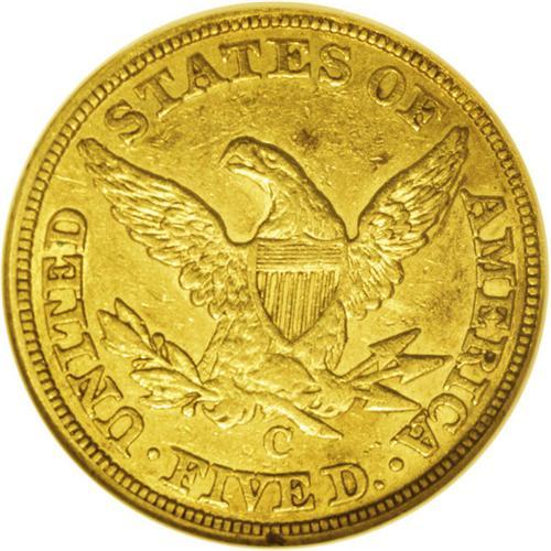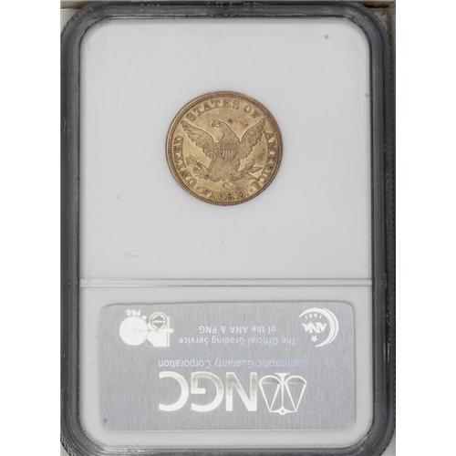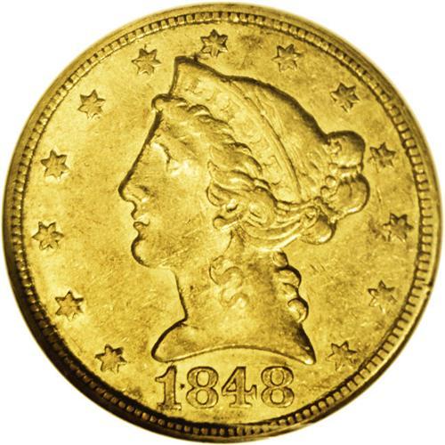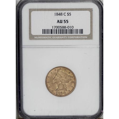 <B>1848-C<$5> AU55 NGC.</B></I> Variety 11-E. Among Charlotte Mint gold coins, the production figure of 64,472 coins was fairly significant, although only a few have survived in top grades. This Choice AU example has deep orange and green-gold color on both sides with only the typical minor abrasions that are so often seen on these pieces. This must have been quite an attractive coin when it was first minted, for the fields retain hints of its original mirrored finish.