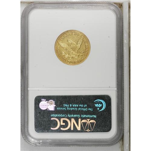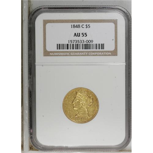 <B>1848-C $5 AU55 NGC.</B></I> Variety 11-E. The mintage of this issue was 64,472 coins, a rather large production for the Charlotte Mint. Among survivors of this coinage, only one die variety has been identified, although logic suggests that more than one die pair must have been used. High grade examples of this date are scarce, despite the mintage. This piece, struck in bright greenish-gold, has nearly full luster and sharp design features, although the surfaces are extensively abraded. It is still a pleasing and desirable Choice AU example.<BR><BR><b>Shipping:</b> Coins & Currency (<a target="_blank" href="http://www.heritageauctions.com/common/shipping.php">view shipping information</a>)
