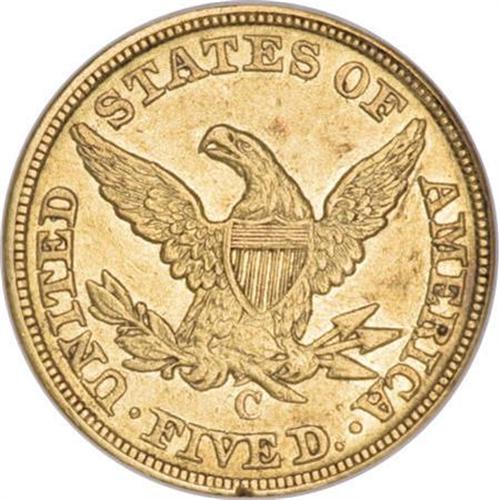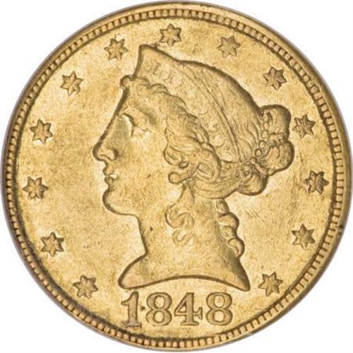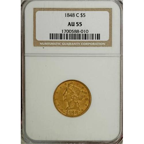 <B>1848-C $5 AU55 NGC.</B></I> Variety 11-E. Among Charlotte Mint gold coins, the production figure of 64,472 coins was fairly significant, although only a few have survived in Mint State. This Choice AU example has deep orange and green-gold color on both sides with fewer than the expected number of small marks. Luster is plentiful and beckons from design recesses. Census: 24 in 55, 24 finer (11/07).<BR><I>From The Waxhaw Collection.</B></I><BR><BR><B>Coin Engraver:</B> Christian Gobrecht<BR><BR><b>Shipping:</b> Coins & Currency (<a target="_blank" href="http://www.heritageauctions.com/common/shipping.php">view shipping information</a>)