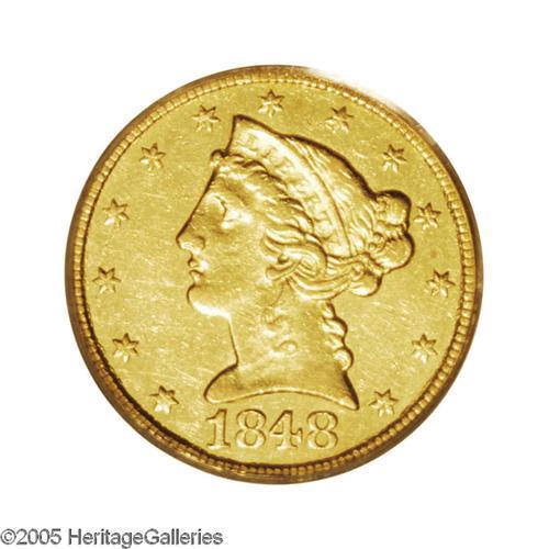 <B>1848-C<$5> AU55 PCGS.</B></I> Variety 11-E. A more difficult issue than the relatively high mintage of 64,472 pieces would suggest, especially in better grades. This example displays normal softness on the highpoints of the design, with fields that show myriad small abrasions that are a bit more choppy on the obverse.<BR><I>From The Frank Manthey Collection of Gold Coins.</B></I>