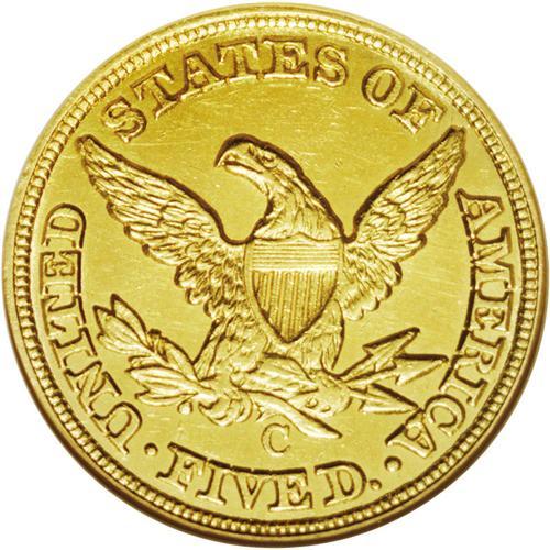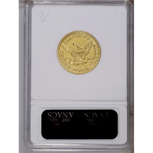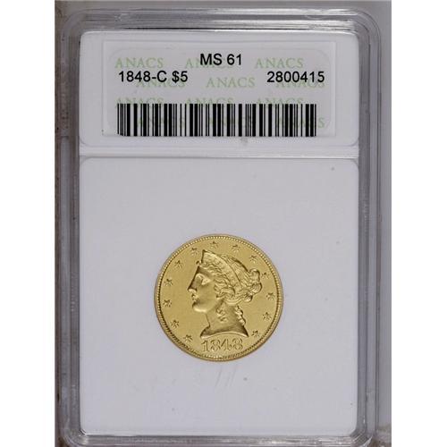 <B>1848-C<$5> MS61 ANACS.</B></I> Variety 11-E. Despite a comparatively high mintage for a Charlotte five, the supply of Uncirculated coins is extremely limited. Offered here is a bright yellow-gold representative that exhibits a small degree of reflectivity that is tempered only by a few wispy abrasions in the fields. The strike is well executed for the issue, being only slightly deficient on the eagle's right (facing) wingtip and talons.