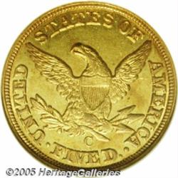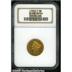 <B>1848-C $5 MS64 NGC.</B></I> Ex: Elrod Collection. Variety 11-E. Even though the mintage of 64,472 pieces seems generous, only 3-4 pieces are believed known in mint condition of the 1848-C with the vast majority of the 145-155 coins believed extant today in the VF-XF grade range. Listed as the finest example known on Winter's Condition Census, this is a magnificent piece of Charlotte gold. We have handled this coin on two previous occasions (in our February 1999 Long Beach Sale and as a part of the Ashland City Collection). As one can infer from the grade, this is a spectacular coin. Some softness of strike is noted on the curls around Liberty's face and there is also some weakness on the eagle's neck and left (facing) leg. However, this softness is slight and hardly detracts from the overall appearance of the coin. The fields are semi-prooflike with quite a bit of reflectivity present. Rich reddish patina covers each side, making the basic green-gold color of the coin virtually invisible now. Only the slightest abrasions are present.