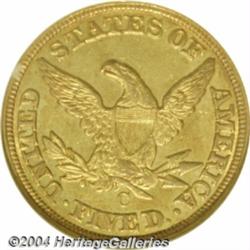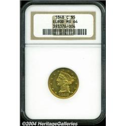 <B>1848-C<$5> MS64 NGC.</B></I> While this date is among the more readily available Charlotte Mint half eagles, very few have survived in high grade. The mintage for this issue totaled 64,472 coins, the fifth highest production of any issue in the history of the Charlotte Mint. Only the 1847, 1849, 1852, and 1853 Charlotte half eagles had higher mintages. Although Doug Winter suggested a total survival of approximately 150 coins, he recorded just three or four Mint State examples in the second edition of <I>Charlotte Mint Gold Coins.</B></I> Since that time, the unrecorded Bass Collection coin appeared on the market with a grade of MS64 by PCGS. Another 16 to 18 AU coins were also mentioned, after which all remaining survivors show moderate to extensive wear or damage, or both.<BR> This is a lovely example with rich green-gold coloration with considerable orange overtones. The fields exhibit numerous fine die finishing lines that impart a reflective, almost prooflike appearance. Although not fully struck, the design elements are rather well detailed, and slightly finer than the typical specimen. Winter stated that "the area below BERT in LIBERTY is especially weak and it typically shows no individual definition in the curls." This example, while weak in this area, does exhibit some hair definition. The surfaces are very lightly abraded, as one would expect for the grade. There are not large "hits" and the only pedigree marker of note is a vertical string of three tiny nicks in the reverse field just above the arrowheads.<BR> There is some confusion regarding the pedigree of this coin. The NGC holder identified this from the Elrod Collection, and Doug Winter records the Elrod coin as pedigreed to the Eliasberg Collection. This Elrod coin was also plated in the first edition of Winter's reference, with this coin matching that plate. The confusing part of this pedigree involves an attempt to match this coin to the Eliasberg plate. There are pedigree markers visible on the Eliasberg plate that do not match this coin, and vice-versa. We would like very much to include the Eliasberg name in the pedigree of this coin; however, we cannot do so in the absence of additional documentation. <BR><BR><B>Important notice:</B> Heritage usually auctions material at the rate of 200-250 lots per hour. On some occasions eBay Live bid software or the Internet may not be able to keep up with the pace of the auction. We recommend placing a realistic absentee bid now as insurance to avoid disappointment. Occasionally the auctioneer may eliminate or reject an eBay Live bid, and the auctioneer may also reopen a lot after the close of the eBay live bidding (usually because we missed an audience bid), and may reject your bid even if it shows you as the winning bidder. By bidding via eBay Live, you agree that Heritage may award the lot to another bidder at its sole discretion under the circumstances described above or any other reasonable circumstances. Since eBay bids are not shown to us until we open the lot on the floor, we treat those bids just like floor bids. In most cases the floor responds before the eBay bid is presented to us, due to Internet lag time, so for consistency we have made it a policy that floor bids are always considered first over tie eBay live bids. Also please note that all Heritage lots purchased through eBay Live carry a 20% Buyer's Premium. Please make sure you read the Terms and Conditions before you bid. </span></font></tr></table></td></tr></table>