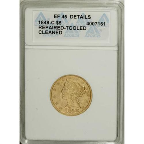 <B>1848-C $5 --Repaired, Tooled, Cleaned--ANACS. XF45 Details.</B></I> Variety 11-E. The obverse has been extensively tooled, although graffiti is still faintly evident on the left field. The reverse is more attractive, but also shows light tool marks on the claws and fletchings.<BR><BR><B>Coin Engraver:</B> Christian Gobrecht<BR><BR><b>Shipping:</b> Coins & Currency (<a target="_blank" href="http://www.heritageauctions.com/common/shipping.php">view shipping information</a>)