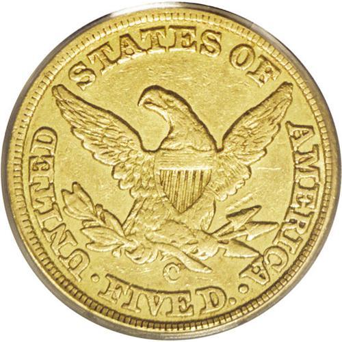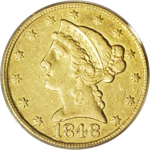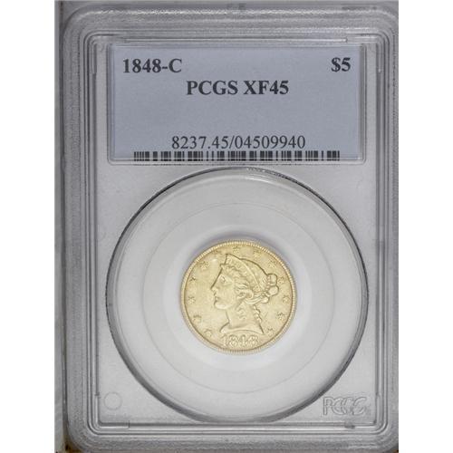 <B>1848-C<$5> XF45 PCGS.</B></I> Variety 11-E. Subtle olive-gold luster illuminates selected areas of this moderately circulated better date No Motto half eagle. A small bagmark above the highest arrowhead is all that is worthy of mention. Striking bluntness on portions of the devices is evident but unavoidable for the issue.<BR><I>From The Carolina Gold Collection, Part Three.</B></I>