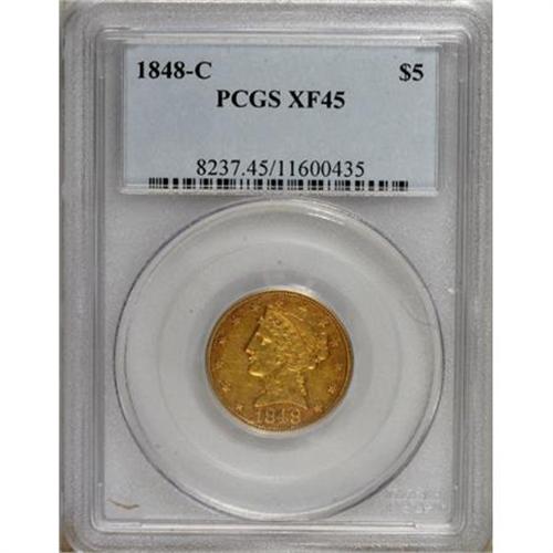 <B>1848-C $5 XF45 PCGS.</B></I> Variety 11-E, the only known variety. Both sides have light abrasions with deep green-gold color at the centers, framed by rich lilac toning.<BR><BR><b>Shipping:</b> Coins & Currency (<a target="_blank" href="http://www.heritageauctions.com/common/shipping.php">view shipping information</a>)