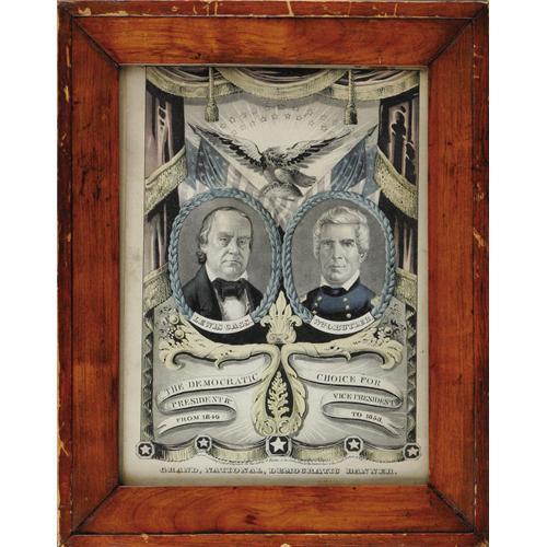 <B>1848 Cass And Butler Lithograph By Nathaniel Currier.</B></I> This Grand National Banner for the Democratic Party carries portraits of candidates Lewis Cass and William O. Butler. Their Whig opponents were promoting Mexican War hero General Zachary Taylor and generally depicted him in full military regalia. Is it possible that the Democrats, not wanting to be too terribly upstaged in the heroism department, played up Butler's service by showing him here in uniform as well? Ironically, Butler was directly under Taylor some two years earlier during the Battle of Monterrey. 12.5" x 16" overall in somewhat later pine frame. Light stains with a small split on the right margin, else fine condition.<BR><BR><b>Shipping:</b> Framed (<a target="_blank" href="http://www.heritageauctions.com/common/shipping.php">view shipping information</a>)