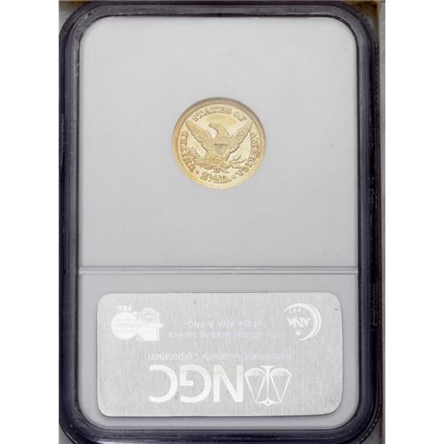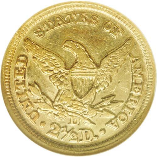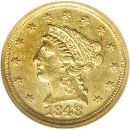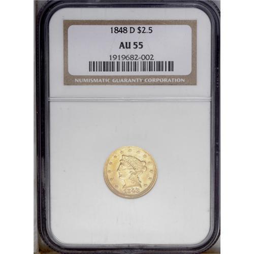 <B>1848-D<$2 1/2> AU55 NGC.</B></I> Variety 10-M. The scarcer of the two varieties of this year, and most easily distinguished by the presence of feathers in the top of the mintmark. Dahlonega quarter eagles are generally better produced and easier to locate in high grades from the 1840s, and the 1848-D is among the finer D-mints available from this decade. As a result, they are often used as type coins, especially in XF and AU grades. This is an excellent choice for type purposes. The surfaces show a bit of reddish patina on each side and there is a noticeable presence of mint luster surrounding the devices. The striking details are just a bit soft in the centers, and the only mark worthy of individual mention is a thin scratch in the lower right obverse field.