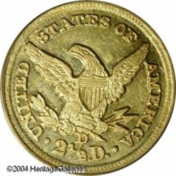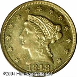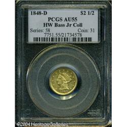 1848-D $2 1/2 AU55 PCGS. Ex: Harry W. Bass Collect <B>1848-D $2 1/2 AU55 PCGS.</B></I> Ex: Harry W. Bass Collection. Very well struck for this scarcer Dahlonega Quarter Eagle, one of a mere 13,771 pieces struck at the popular Georgia mint. The obverse devices and rims are cleanly delineated while the reverse denticles exhibit the striking weakness that characterizes this issue. A delicate reddish tint is seen over the native green-gold alloy. The more common die variety of this issue, the D mintmark is high with its upper portion clearly filled by the underlying arrow feathers. <BR><BR><B>Important notice:</B> Heritage usually auctions material at the rate of 200-250 lots per hour. On some occasions eBay Live bid software or the Internet may not be able to keep up with the pace of the auction. We recommend placing a realistic absentee bid now as insurance to avoid disappointment. Occasionally the auctioneer may eliminate or reject an eBay Live bid, and the auctioneer may also reopen a lot after the close of the eBay live bidding (usually because we missed an audience bid), and may reject your bid even if it shows you as the winning bidder. By bidding via eBay Live, you agree that Heritage may award the lot to another bidder at its sole discretion under the circumstances described above or any other reasonable circumstances. Since eBay bids are not shown to us until we open the lot on the floor, we treat those bids just like floor bids. In most cases the floor responds before the eBay bid is presented to us, due to Internet lag time, so for consistency we have made it a policy that floor bids are always considered first over tie eBay live bids. Also please note that all Heritage lots purchased through eBay Live carry a 20% Buyer's Premium. Please make sure you read the Terms and Conditions before you bid. This lot is being auctioned in conjunction with a live floor auction by Heritage Galleries & Auctioneers. All final auction and invoice information will be supplied by Heritage Galleries & Auctioneers, and all other information should be considered preliminary. Lot:6497