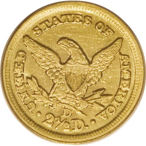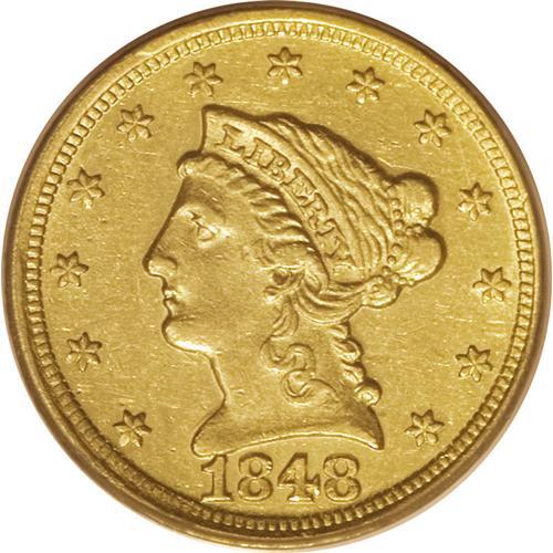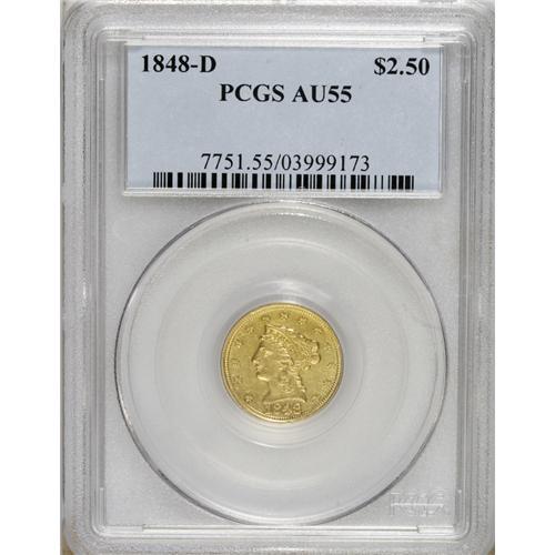<B>1848-D $2 1/2 AU55 PCGS.</B></I> Variety 10-N. Choice AU with prooflike surfaces, although the mirrored appearance is somewhat subdued by the brief handling that this coin has experienced over the years. Both sides have a nice strike and attractive green-gold coloration. Excellent quality for the grade, and a slightly scarcer variety.<BR><BR><b>Shipping:</b> Coins & Currency (<a target="_blank" href="http://www.heritageauctions.com/common/shipping.php">view shipping information</a>)