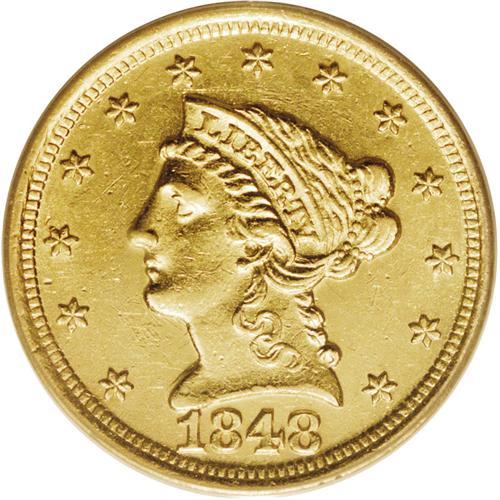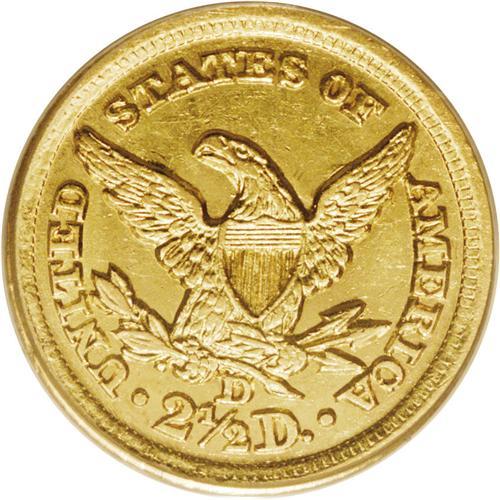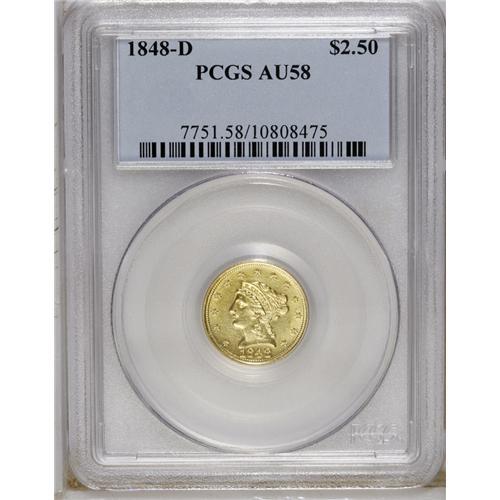 <B>1848-D $2 1/2 AU58 PCGS.</B></I> Variety 10-N. The scarcer of the two known die marriages. A well struck near-Mint Dahlonega quarter eagle with an impressive band of mint luster throughout the borders and devices. The reverse is surprisingly mark-free, while the obverse has only minor marks near the chin and on the cheek. A scant 13,771 pieces were struck. Population: 24 in 58, 20 finer (11/06).<BR><BR><b>Shipping:</b> Coin/Currency (<a target="_blank" href="http://www.heritageauctions.com/common/shipping.php">view shipping information</a>)