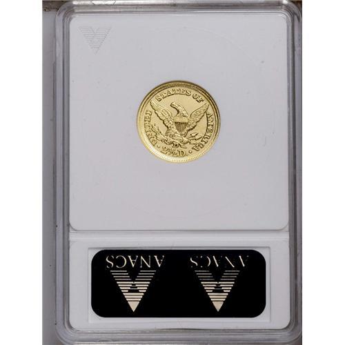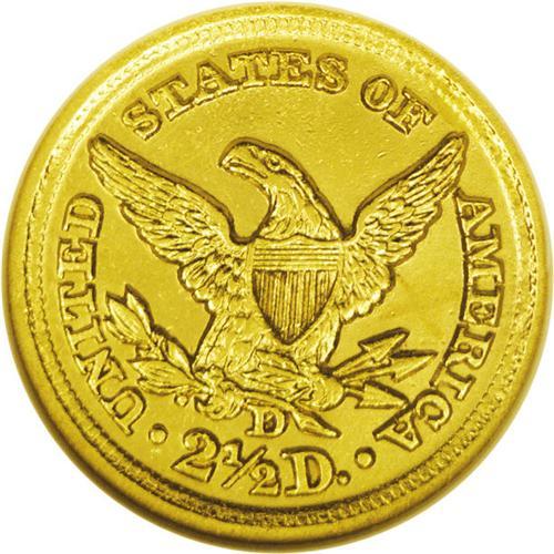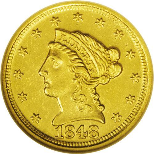 <B>1848-D<$2 1/2>--Altered Surfaces--ANACS. AU55 Details.</B></I> Variety 10-M. The commoner of the two varieties of this year, and most easily distinguished by the presence of feathers in the top of the mintmark, and the upper right curve of the mintmark that touches the branch. Bright canary-gold surfaces reveal fine hairlines, and appear to have been whizzed, causing micro-porosity throughout. The design elements show nice detail, though some smoothness is noted on the eagle's leg feathers.