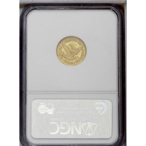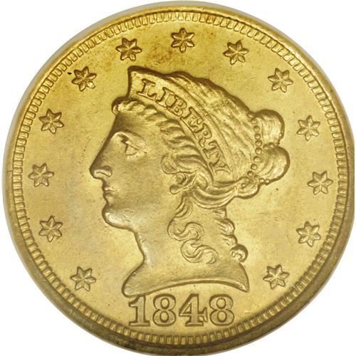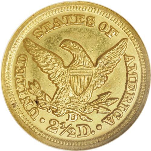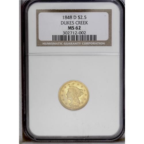 <B>1848-D<$2 1/2> MS62 NGC.</B></I> Variety 10-M. Reverse of 1847. This is the more common of the two varieties known for the year.<BR> Sharply struck, with choice surfaces and medium to deep orange-gold color on the obverse and the reverse. This is another issue that tends to come with comparatively good eye appeal, making it an excellent candidate for a type set.<BR> In 1848, the Dahlonega Mint produced 13,771 quarter eagles. There are around 200 known today, with close to three-quarters of these in the VF to XF grade range. AU coins are scarce, although they are more available than most Dahlonega quarter eagles of this era. There are as many as a dozen known in Uncirculated, with many of these in the MS60 to MS61 range. The finest known example is the Green Pond: 1026 coin that sold for $23,575 in Heritage's January 2004 auction. On the Condition Census, the Duke's Creek coin is listed as the second finest known, and it is clearly nicer than the other pieces that are graded MS62 by NGC and PCGS.<BR> This would make an ideal coin for the collector seeking a single higher grade, well-produced Dahlonega quarter eagle for a type set.<BR><I>Ex: Bowers and Merena (1/92), lot 1359, where it brought $13,200; Hancock and Harwell.</B></I><BR><I>From The Duke's Creek Collection of Dahlonega Gold.</B></I>