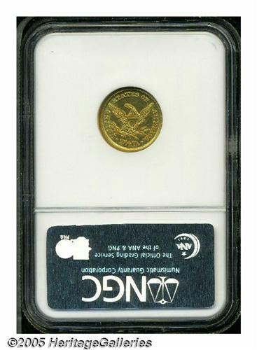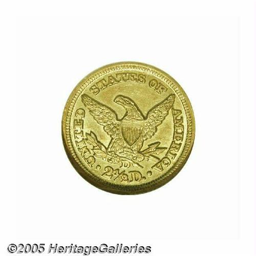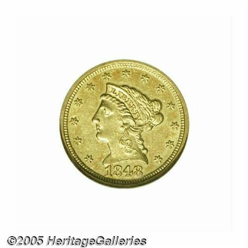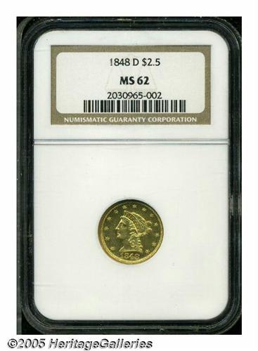 <B>1848-D<$2 1/2> MS62 NGC.</B></I> Variety 10-M (per Doug Winter's second edition and revised attribution system). The mintmark is entered high, and touches the olive stem. Extremely well struck at the centers with an almost medallic quality noted on the devices. Even the obverse and reverse borders show complete denticulation. Pronounced prooflikeness remains in selected protected areas and tinges of antique-golden color can be seen in the fields. There are some light scuff marks on each side but no luster breaks on the high spots. While generally regarded as one of the more available Dahlonega Quarter Eagles in high grades, the 1848-D is a very rare coin in full Mint State. Population: 6 in 62, 2 finer (5/05).