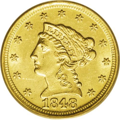 <B>1848-D $2 1/2 MS62 PCGS.</B></I> Variety 10-M. Two varieties are known, and this 10-M variety is more plentiful. The other variety, 10-N, has the mintmark closer to the fraction. This lustrous Mint State example is a splendid piece with frosty luster and brilliant yellow-gold color. Although a few abrasions are evident on each side, this example is much nicer than normally seen. Although the date is one of the more plentiful quarter eagles from the Dahlonega Mint, it is still a rarity in all Mint State grades. Population: 8 in 62, 5 finer (10/06).<BR><BR><b>Shipping:</b> Coin/Currency (<a target="_blank" href="http://www.heritageauctions.com/common/shipping.php">view shipping information</a>)