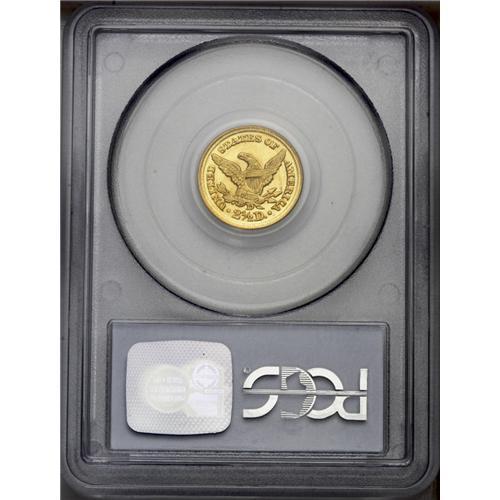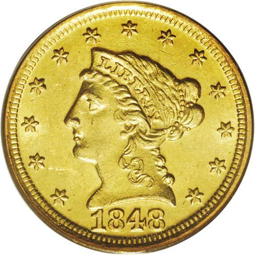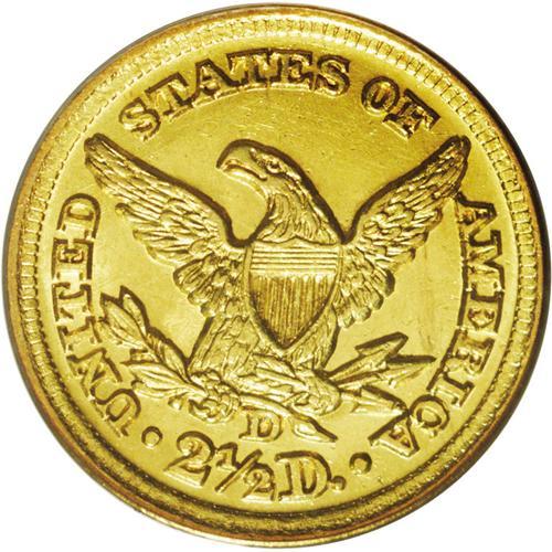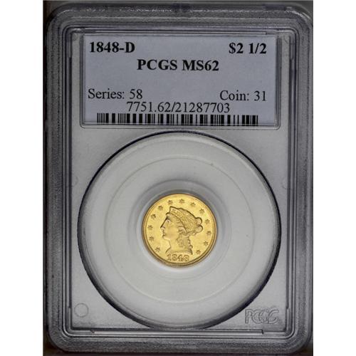 <B>1848-D<$2 1/2> MS62 PCGS.</B></I> Variety 10-M (per Doug Winter's second edition and revised attribution system). The mintmark on this variety was punched in high, and touches the olive stem. The 1848-D is one of the more frequently encountered Dahlonega quarter eagles. Close to 200 pieces are believed known today with most examples concentrated in the XF and AU grade range. Around a dozen Uncirculated coins are known today and most of those are clustered in the MS60-61 range. This piece is tied with several others as second finest certified, an unknown number of which are doubtless resubmissions. This piece shows bright copper-gold coloration, and the striking details are strongly defined, as usual. A number of small abrasions are scattered over each side, the only one of singular mention being a shallow scrape above Liberty's head.