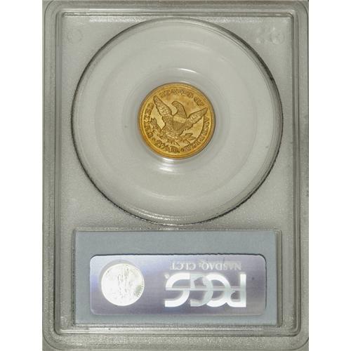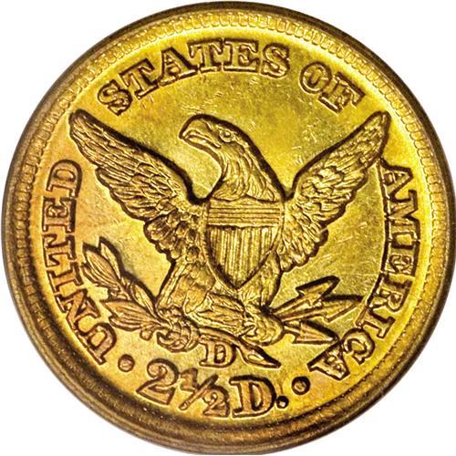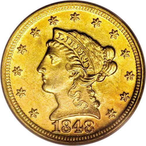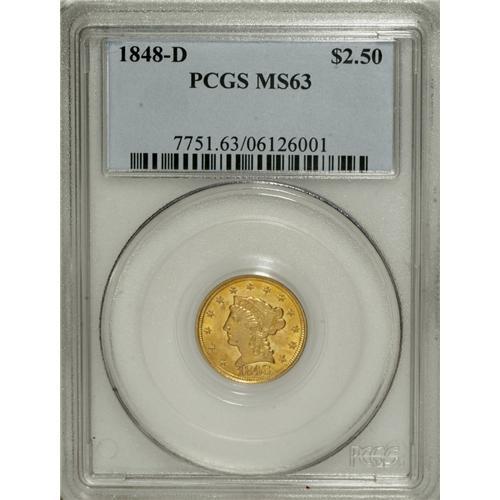 <B>1848-D $2 1/2 MS63 PCGS.</B></I> Variety 10-M. An amazing example of the issue, this piece has sharp design definition on both sides with frosty green-gold luster that exhibits traces of light orange toning. Only a handful of pieces grade MS60 or finer, and none have been certified by either NGC or PCGS in any finer grade than this piece. Doug Winter comments: "The 1848-D quarter eagle is typically available in Extremely Fine grades. It is scarce but obtainable in the lower About Uncirculated grades. It becomes rare in the higher AU grades and it is very rare in Mint State." He estimated a total Mint State population of just five to seven different pieces, although today the quantity may be as many as 10 such coins.<BR><BR><b>Shipping:</b> Coins & Currency (<a target="_blank" href="http://www.heritageauctions.com/common/shipping.php">view shipping information</a>)