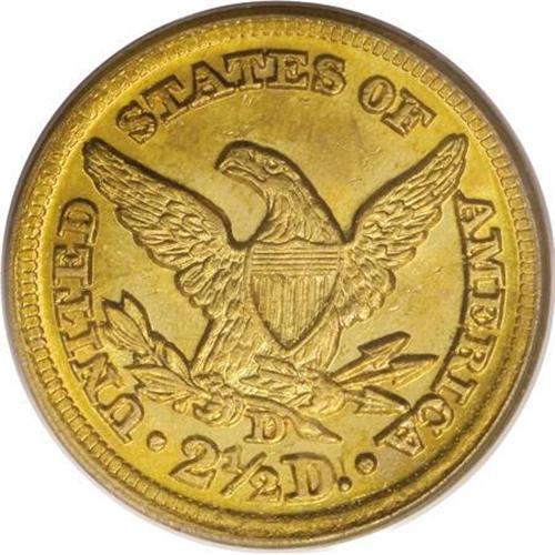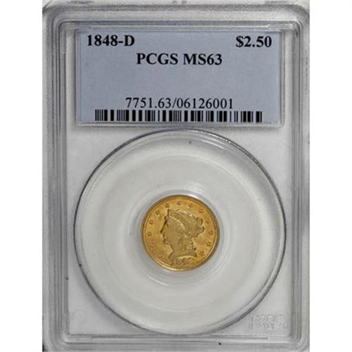 <B>1848-D $2 1/2 MS63 PCGS.</B></I> Variety 10-M. A crisply struck and delightful representative of this mid-date Dahlonega issue, one less available than its reputation as a comparatively common branch mint quarter eagle might suggest. The strongly lustrous, slightly granular surfaces have a pleasing appearance, predominantly yellow-gold with zones of richer orange-gold color.<BR> Between these factors, the overall visual appeal is high, a feature shared by a number of other examples. Doug Winter (2003) comments: "For many collectors, the 1848-D quarter eagle makes an ideal type coin." He describes the issue as well-prepared and characterizes most examples as having "a good strike and good luster." Even for this comparatively well-produced issue, the coin offered here is far above the norm, and would fit beautifully into any connoisseur's set of Dahlonega gold. Doubtless Condition Census material, with none graded finer by either NGC or PCGS and the extant numbers inflated by resubmissions. Population: 6 in 63, 0 finer (6/07).<BR><BR><B>Coin Engraver:</B> Christian Gobrecht<BR><BR><b>Shipping:</b> Coins & Currency (<a target="_blank" href="http://www.heritageauctions.com/common/shipping.php">view shipping information</a>\)