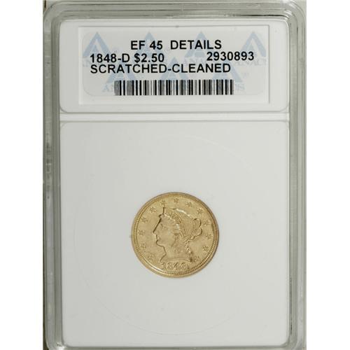 <B>1848-D $2 1/2 --Scratched, Cleaned--ANACS. XF45 Details.</B></I> Variety 10-M. A couple of light pinscratches crisscross on Liberty's neck, and there is a deep, metal-moving gouge above the eagle's head on the reverse. The old cleaning is not especially distracting, and the few abrasions are consistent with grade.<BR><BR><b>Shipping:</b> Coin/Currency (<a target="_blank" href="http://www.heritageauctions.com/common/shipping.php">view shipping information</a>)